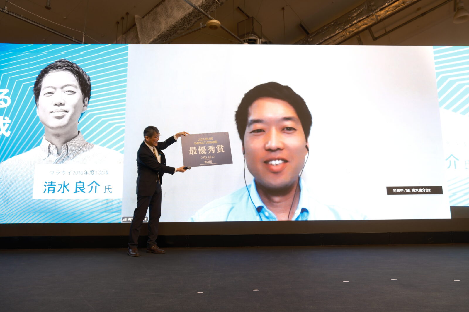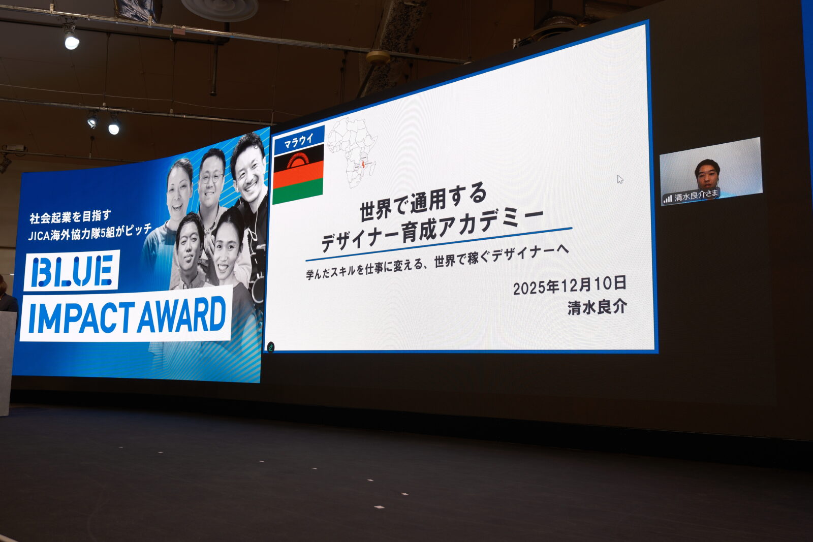 マラウイからオンラインで参加した清水氏は、「アフリカで起業するのは孤独だったが、JICA BLUEで仲間やメンターに何度もビジネスプランを聞いてもらい、このプランは自分一人で作ったものではない。せっかく賞もいただいたので、絶対に形にできるよう頑張ります」と決意を語りました。