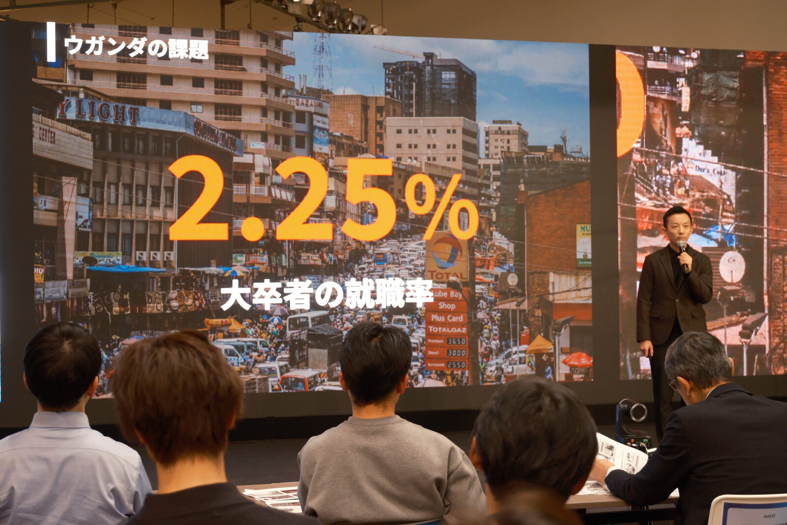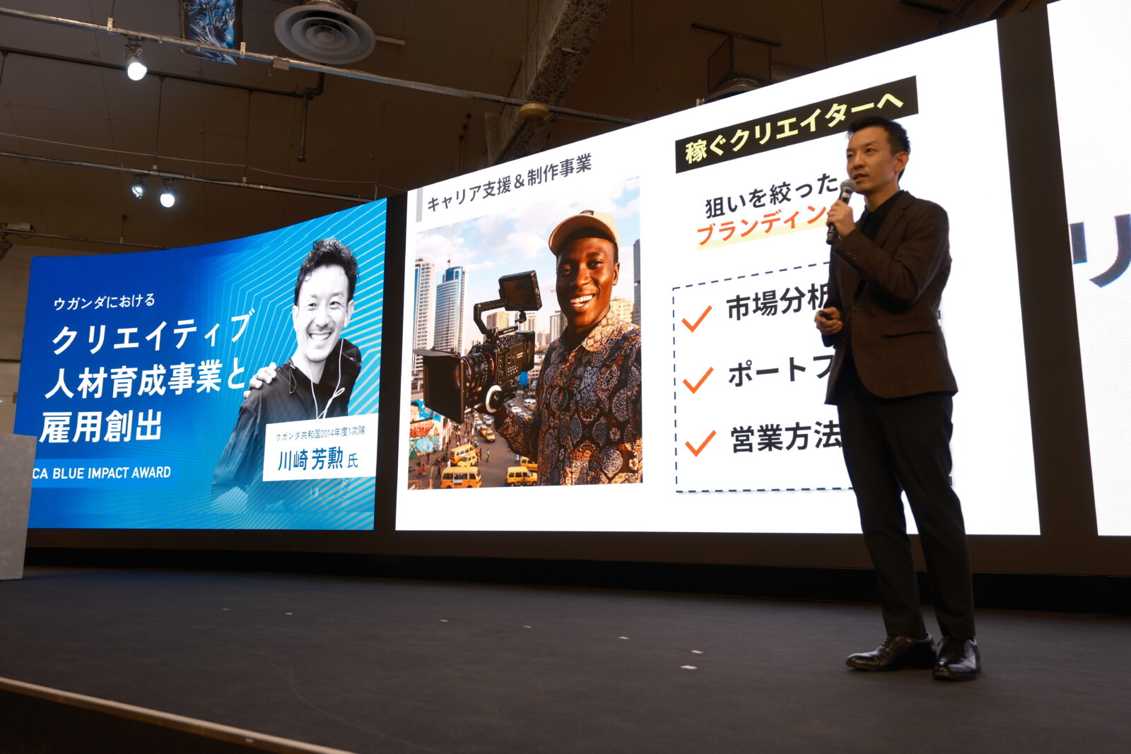 ウガンダでは大卒者の就職率はわずか2%程度。一方で、全人口の83%が39歳以下という圧倒的に若い人口構成と、英語が公用語であるため欧米諸国との取引が可能という強みがあります。川崎氏は、映像・写真を学ぶハイブリッドプログラム、Creative-Hubの運営、キャリア支援という3つの事業を通じて、学びから仕事までを一貫してサポートする仕組みを提案しました。