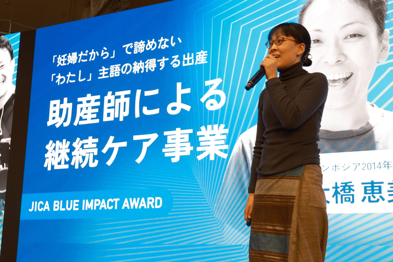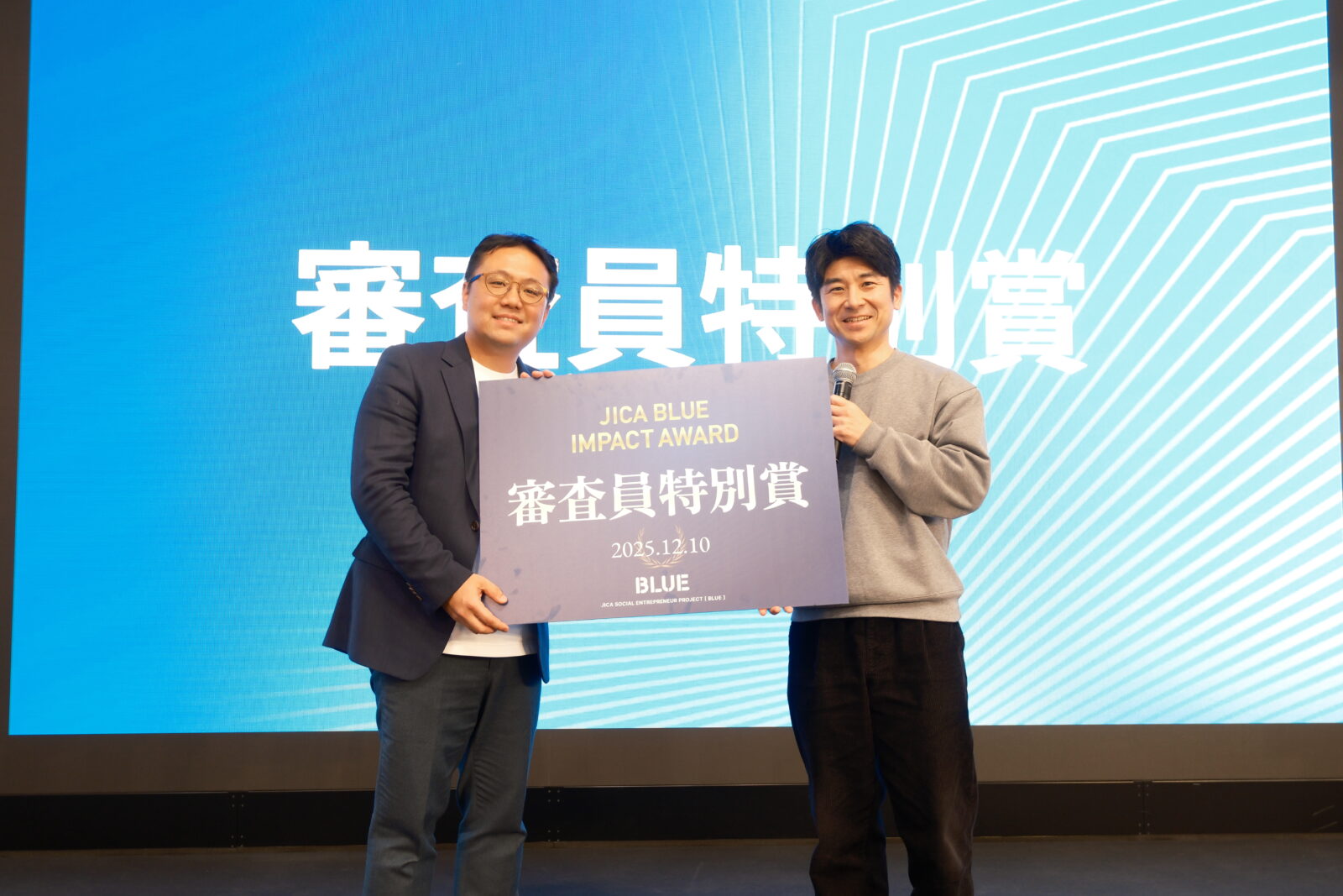 第二部では、「JICA BLUE Impact Award」と題し、JICA BLUE Academyの社会起業家育成伴走プログラムに参加した1期生2名、2期生3名の計5名がビジネスプランを発表しました。審査は社会性、事業性、起業家力の3つの評価軸で行われ、最優秀賞と審査員特別賞が選ばれました。