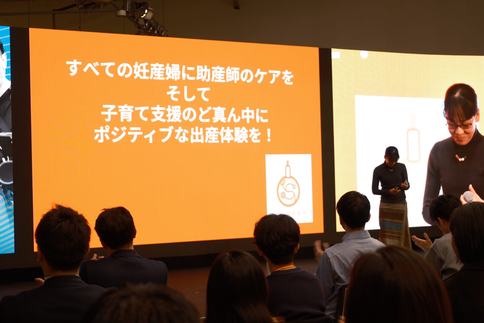 出産子育て応援金の10万円を活用できる価格設定で、妊娠中5回の個別相談、妊婦同士の繋がりを作る5つのクラス、産後のケア、2週間健診、2ヶ月健診までをパッケージ化。「すべての妊産婦に助産師のケアを、そして子育て支援のど真ん中にポジティブな出産体験を」と熱く語りました。